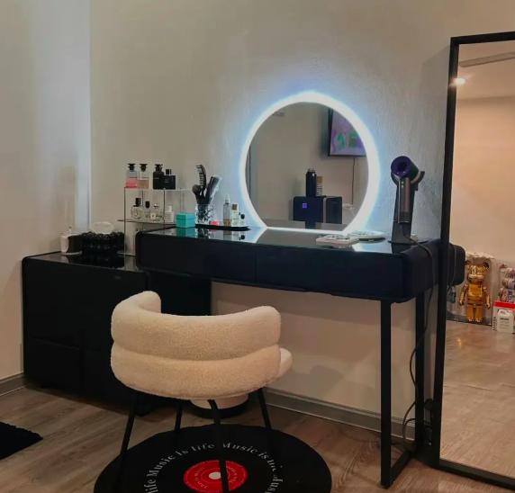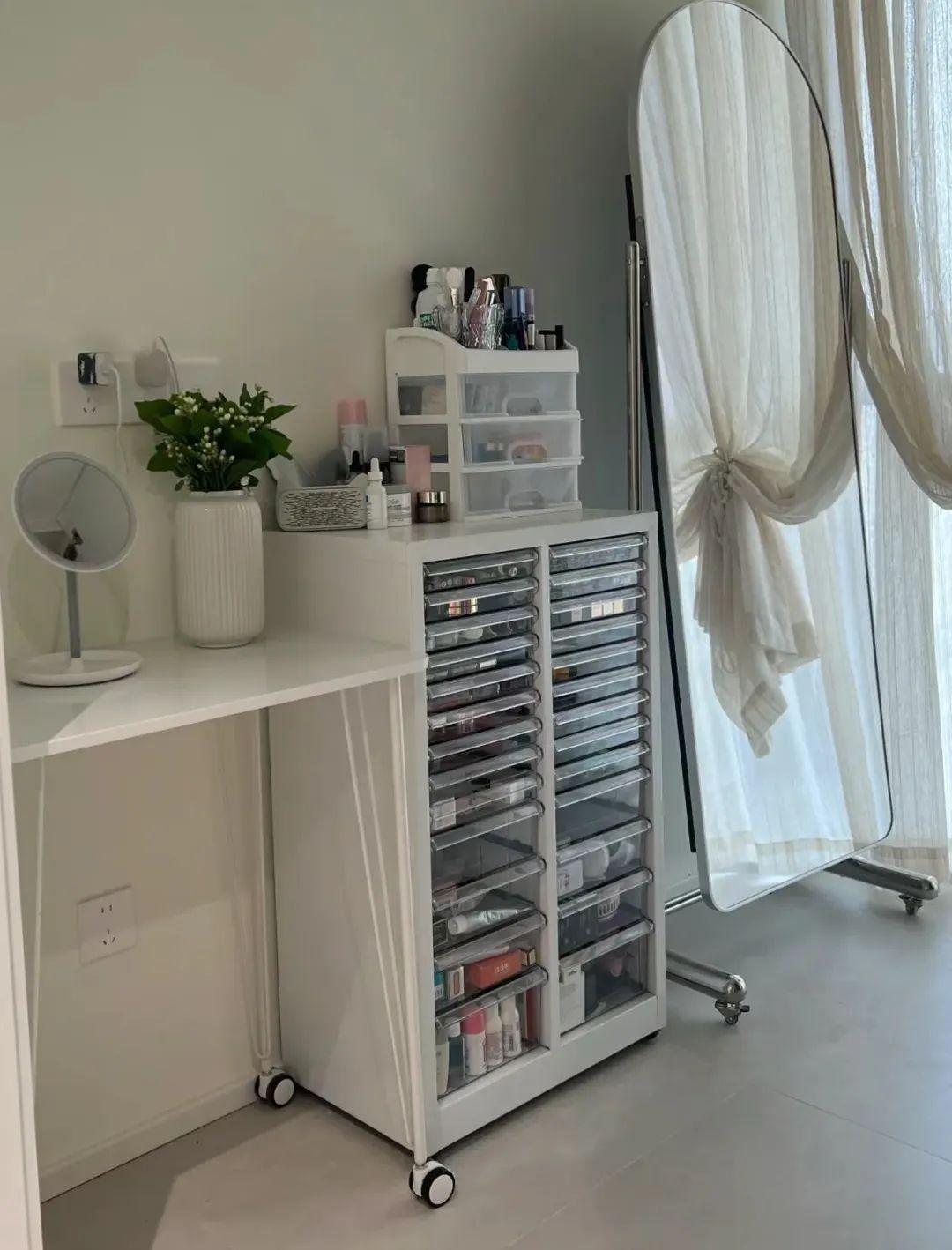 性價比更高的方案還有:一個可升降帶滑輪小桌子,站着、坐着都可以化妝,加全身鏡,再加收納鐵皮神櫃。這個組合搭配不僅限於臥室,客廳也可以放。