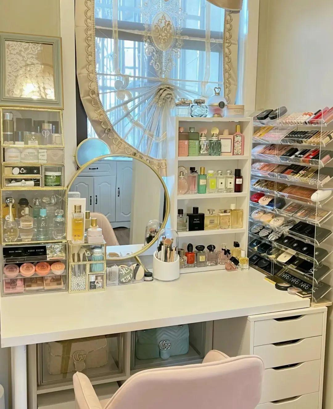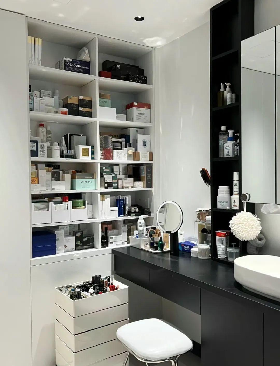 其二,收納充足,側面是到頂的陳列收納櫃,容量超大,頂部放買的各類囤貨,下面放每日要用的彩妝用品,桌面上還可以再放護膚品,就一個爽字!