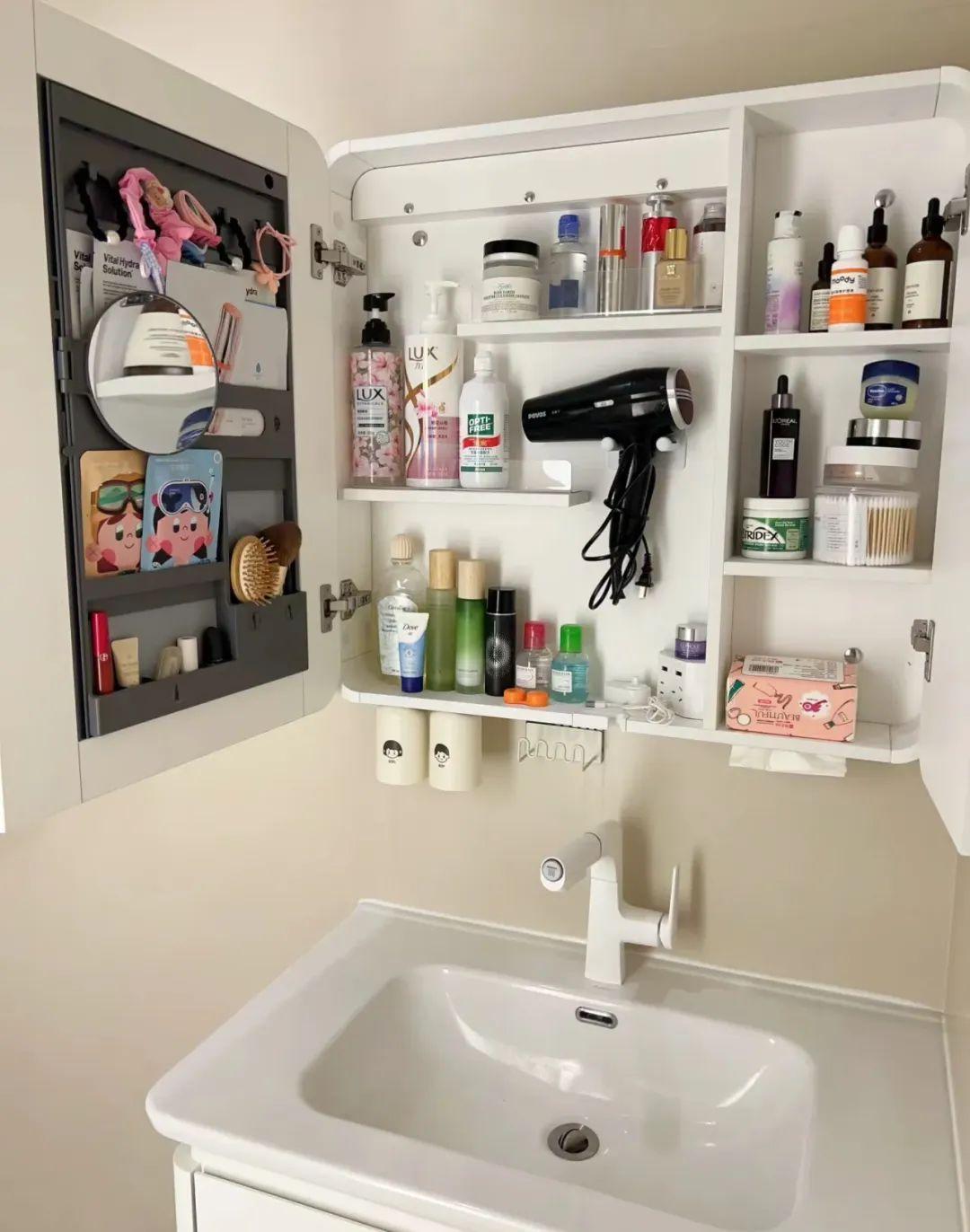 在側面的鏡櫃裏,安裝有磁力的琺琅板,將所有化妝品的背面都貼上磁力膠,吸附在琺琅板上,一目瞭然,拿取方便,收納更輕鬆。