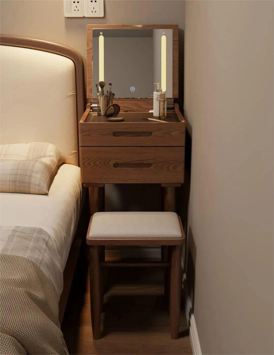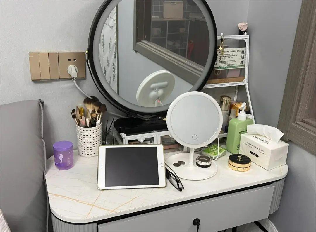 常規型:方桌帶抽屜,桌腿側邊闢出一塊作收納櫃,帶燈鏡子靠牆放在桌上。