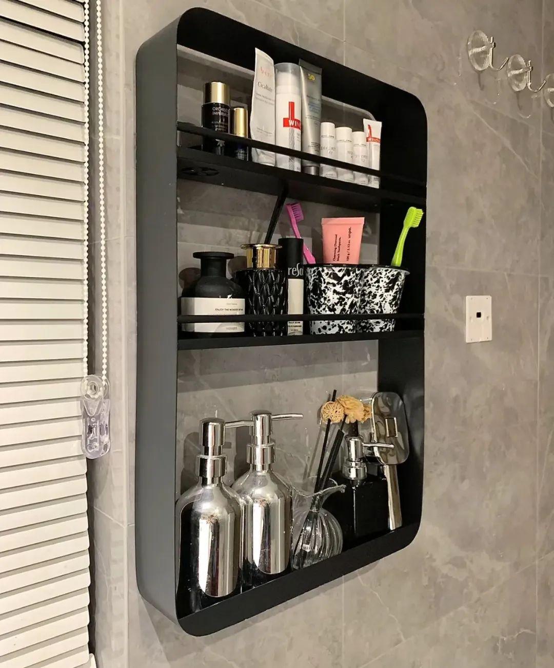 利用免釘膠和透明的亞克力雜物盒,在洗漱臺旁邊牆壁上做收納,順手拿取,無比方便。