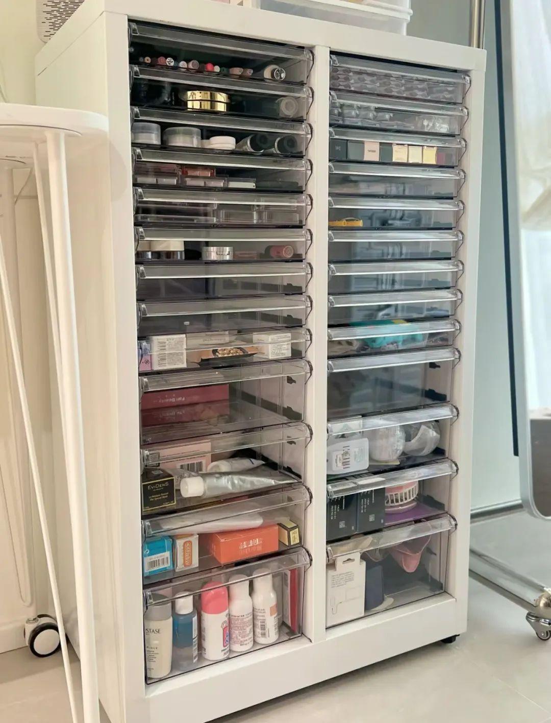 本身就在收納界封神的鐵皮收納櫃,容量大,有分層明確,拿取方便,價格又便宜。化妝完化妝品全部收進神櫃裏,桌面依舊保持整潔。
