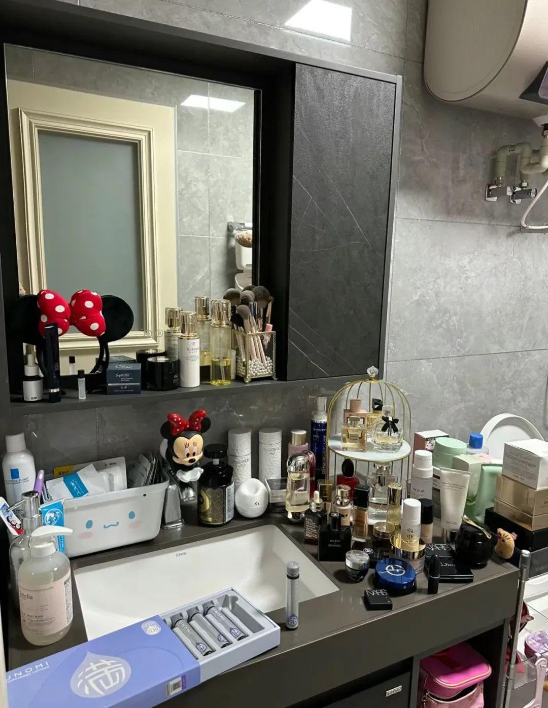 不喜歡整齊地擺放物品,化妝品隨性地鋪在洗漱臺上,用什麼一眼就找到,此處劃重點:凌亂不等於邋遢。
