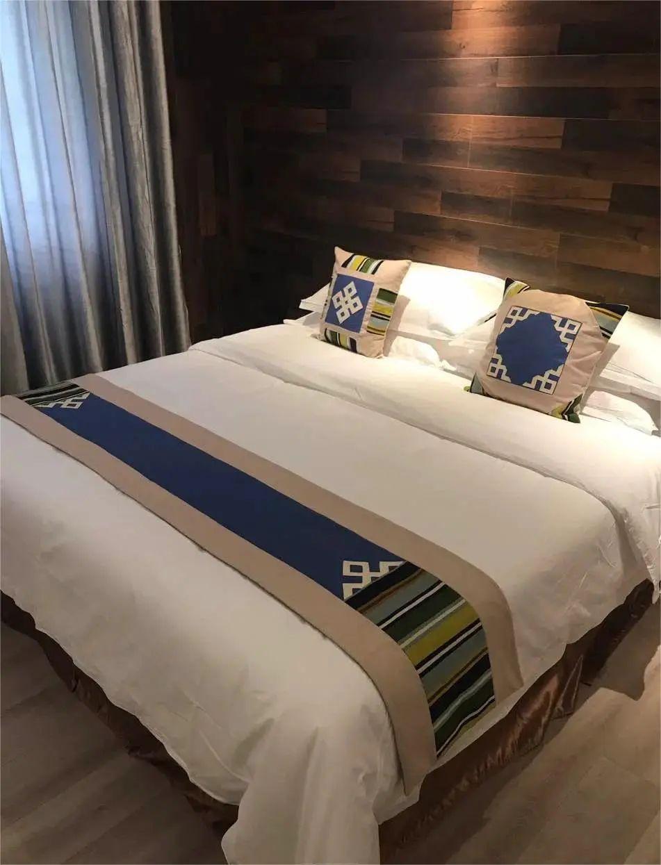 好多酒店牀上會鋪着的一塊花紋複雜的牀尾布,也叫牀旗,其實是一個舶來品,原本是用來防止弄髒牀單的,因爲老外經常不脫鞋躺在牀上,或者在牀上喫早餐。