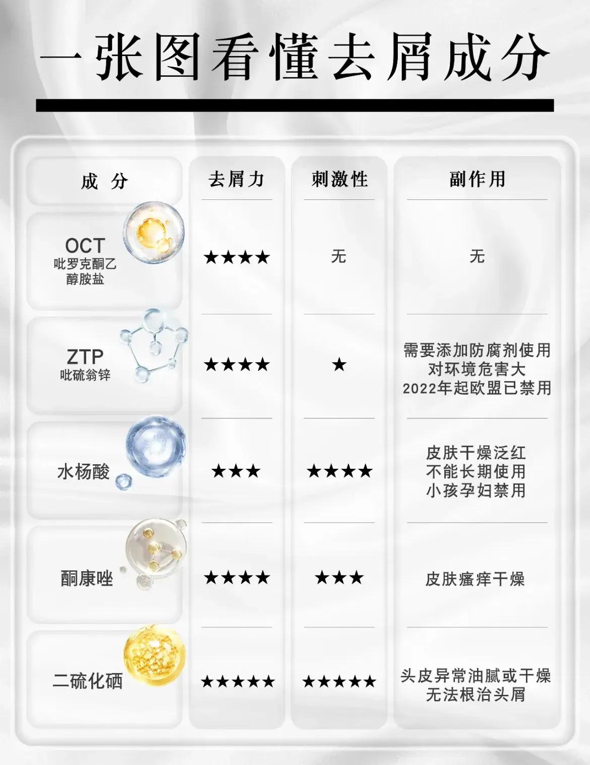 去屑成分:水楊酸、吡硫鎓鋅(ZPT)、吡羅克酮乙醇胺鹽、酮康唑、氯咪巴唑等都是,其中,吡羅克酮乙醇胺鹽是廣譜的抑菌劑,可以改善頭屑問題。