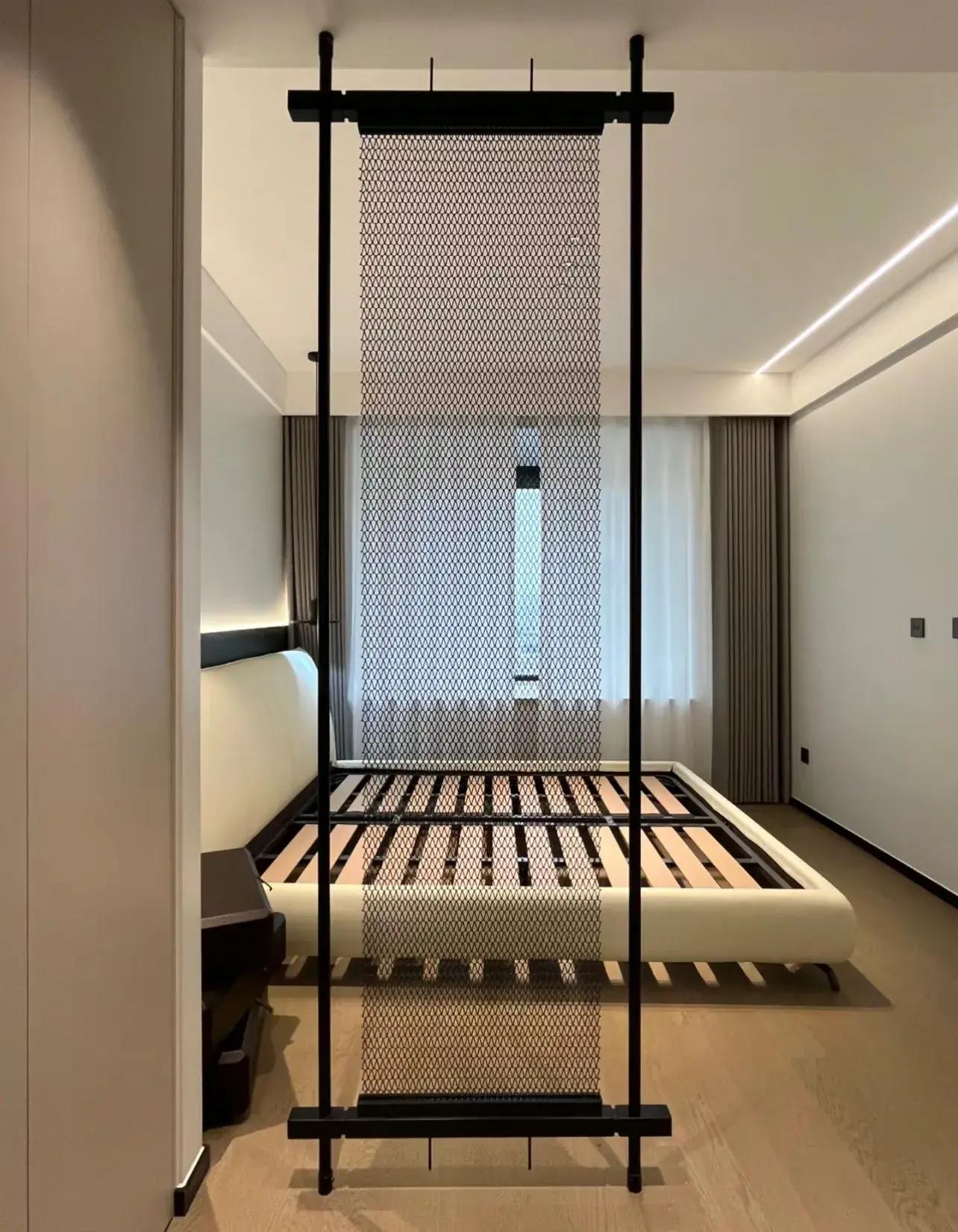 像這個案例中,屋主不能接受衛生間對門,又嫌用普通屏風,影響採光、通透感,就做了這麼一個金屬的網屏風,解決問題。