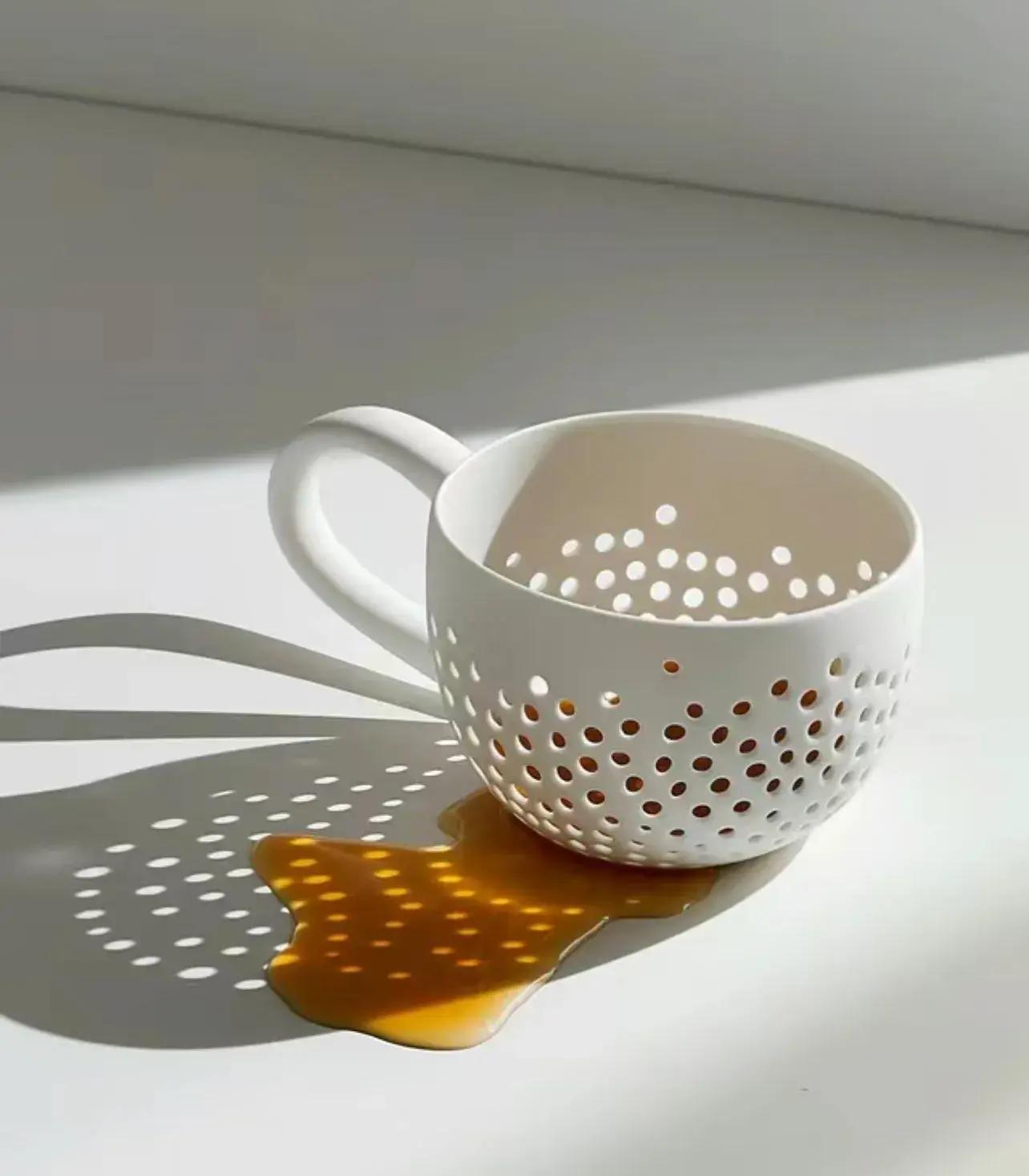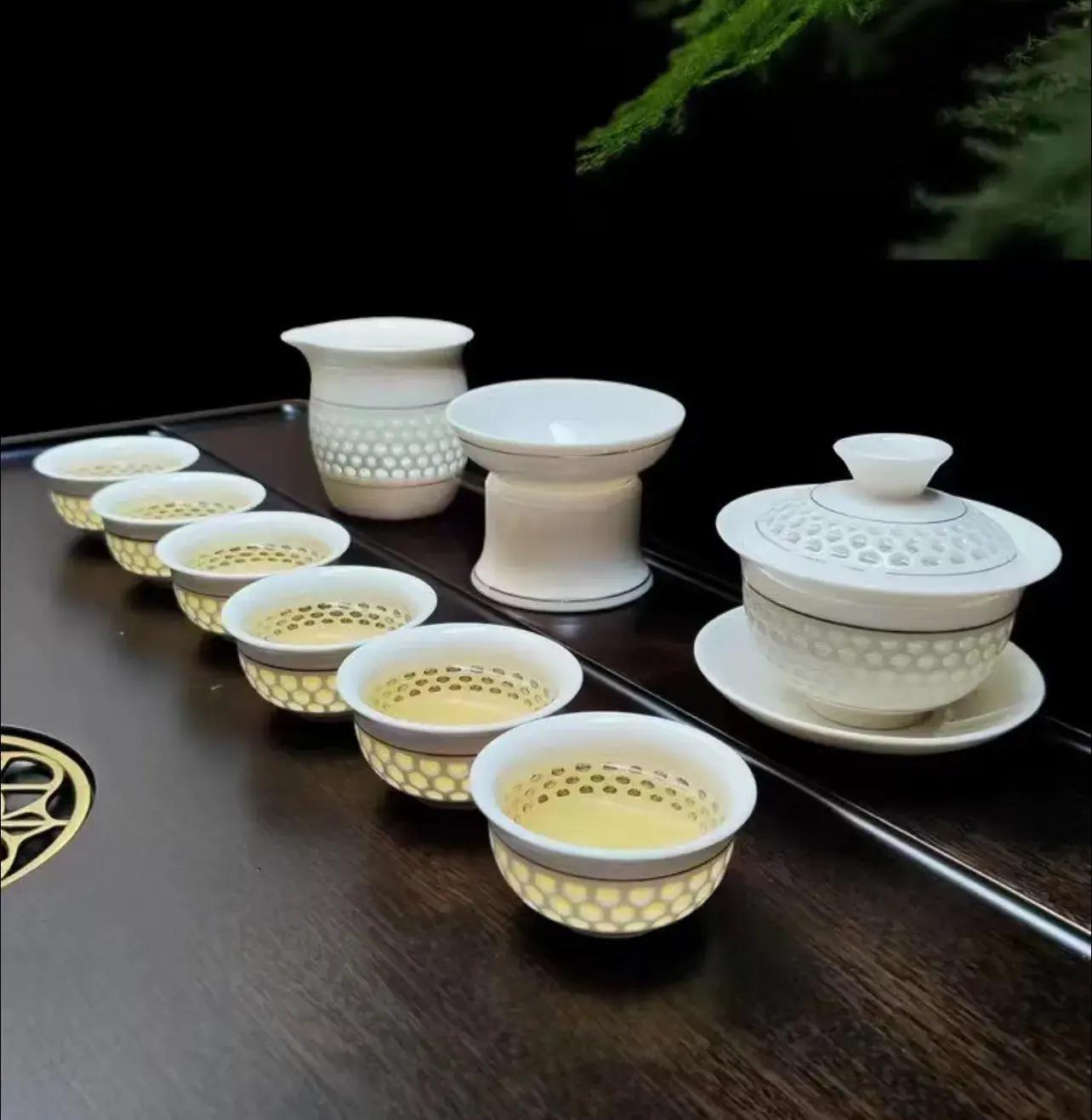 陶瓷裏面有一種,看着是鏤空的,中間其實填以玲瓏釉,倒上茶之後,就跟點亮了燈一樣,靈動而絕美。