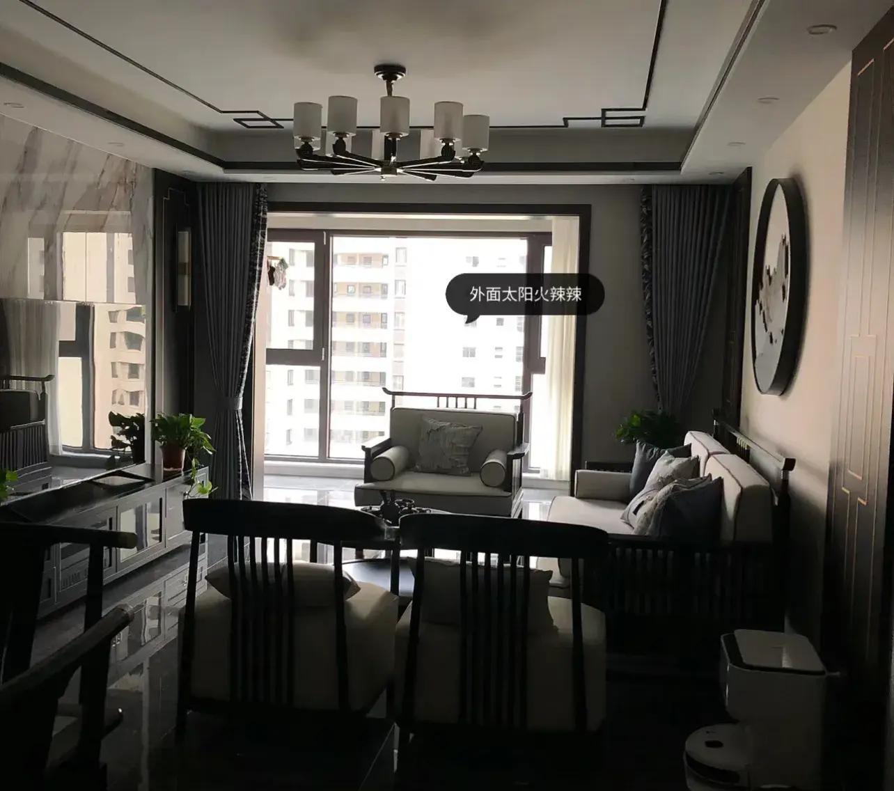 這個案例中,深色的中式傢俱配上深灰色的瓷磚,外面是太陽高照,家裏“真·黑中式”。