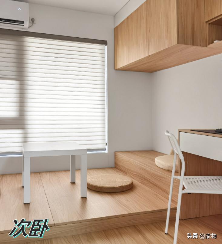 當原客餐廳重新規劃出一間次臥後,安裝了格柵移門隔斷,保障了室內的採光。懸浮式地臺的設計,爲內部賦予了休閒的屬性。走進次臥內部,地面設計了二階地臺,方便席地休閒或當牀使用。房間雖沒有標準衣櫃,但地臺和牀頭上方的吊櫃滿足了換季衣物的儲物需求。將Switch等遊戲機連接上A300系列電視後,就是移動的遊戲廳了。