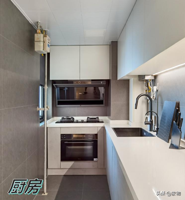 空間採用開放式設計,櫥櫃向外延伸,增加了操作檯和儲物的面積。櫥櫃選用白色調,吊櫃底部內嵌燈光,避免了燈下黑的現象。而A300系列電視的加入,可以爲廚房請來一位“大廚”,變看教程邊做菜。