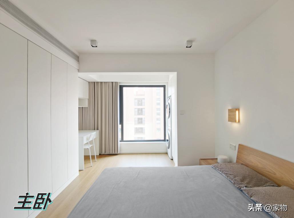 主臥門洞向右平移,牀尾設計了內嵌式的大衣櫃,空間簡潔。牆面留白搭配清爽的原木元素,乾淨有溫度,給人內心安定的感受。