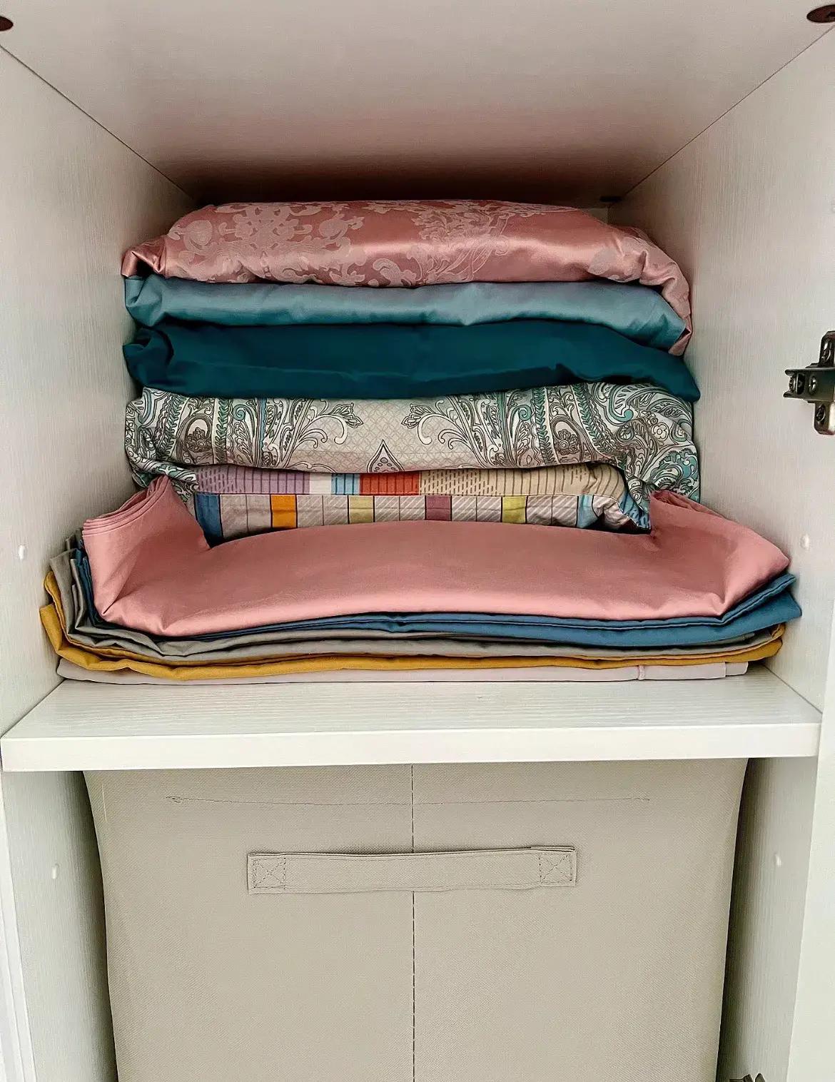 像我被子就兩套,一薄一厚,厚的管春秋冬、薄的管夏;牀品套件,也只有兩套,髒了有換洗的就行,收納根本不存在什麼負擔,敞亮整潔的衣櫃空間,看着舒服、整理也不費勁。