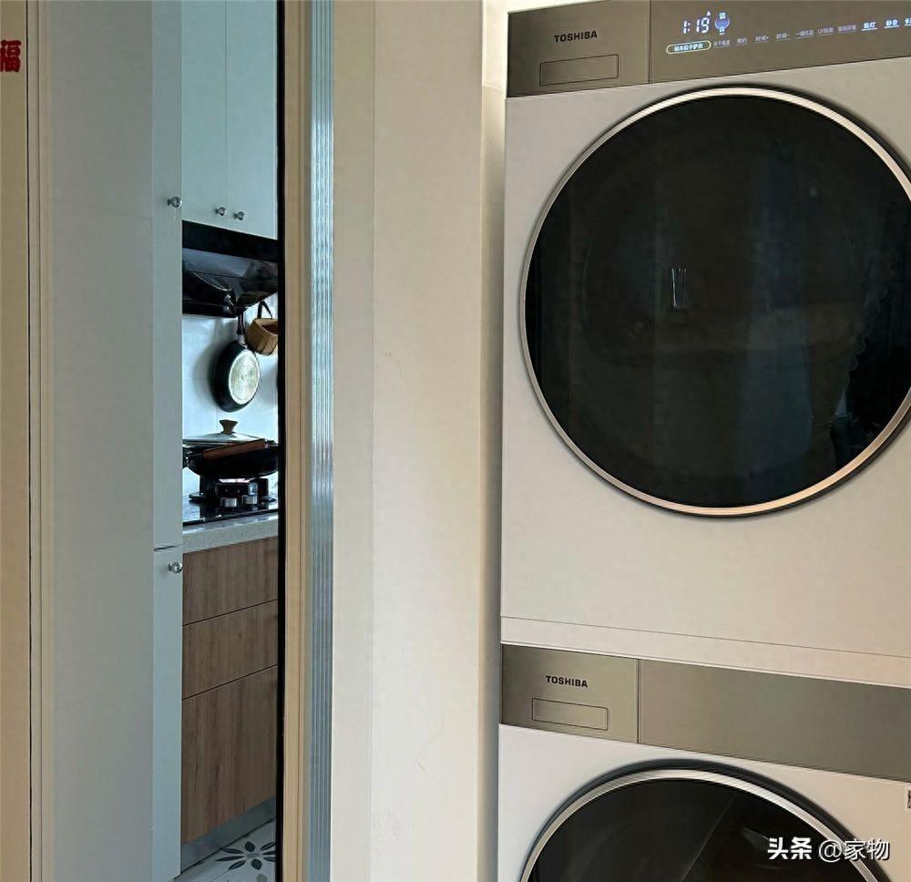 家裏的廚房和衛生間是兩個相對的小空間,廚房門放在了一組洗烘一體機的旁邊,從側面看,乍一看彷彿看不到門扇,但實際上,這間只有3.8㎡的小小廚房入口,就隱藏在了這裏。