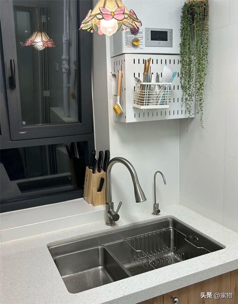 值得一提的是,水槽的尺寸超大,方便洗碗洗菜,上面用洞洞板隱藏了燃氣熱水器的管路,上面還可以掛置一些清潔刷的餐廚具用品和擺件,我個人感覺真的是又好看又實用。