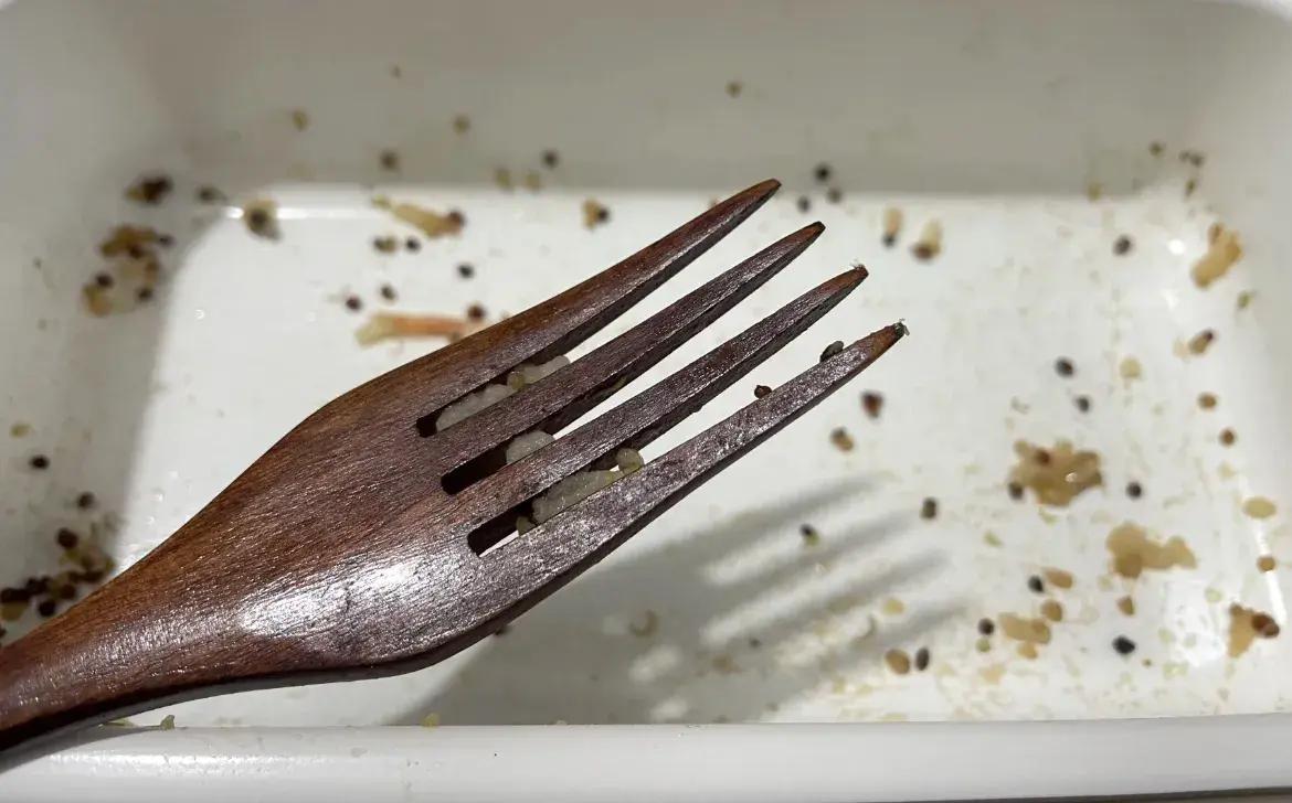有一些雖然沒有到裂開、劈叉的地步,但也不省事,在乾燥的時候,木質餐具整體口感會變粗糙,甚至掉屑,尤其是筷子和勺子,一度會懷疑自己沒少喫木渣。