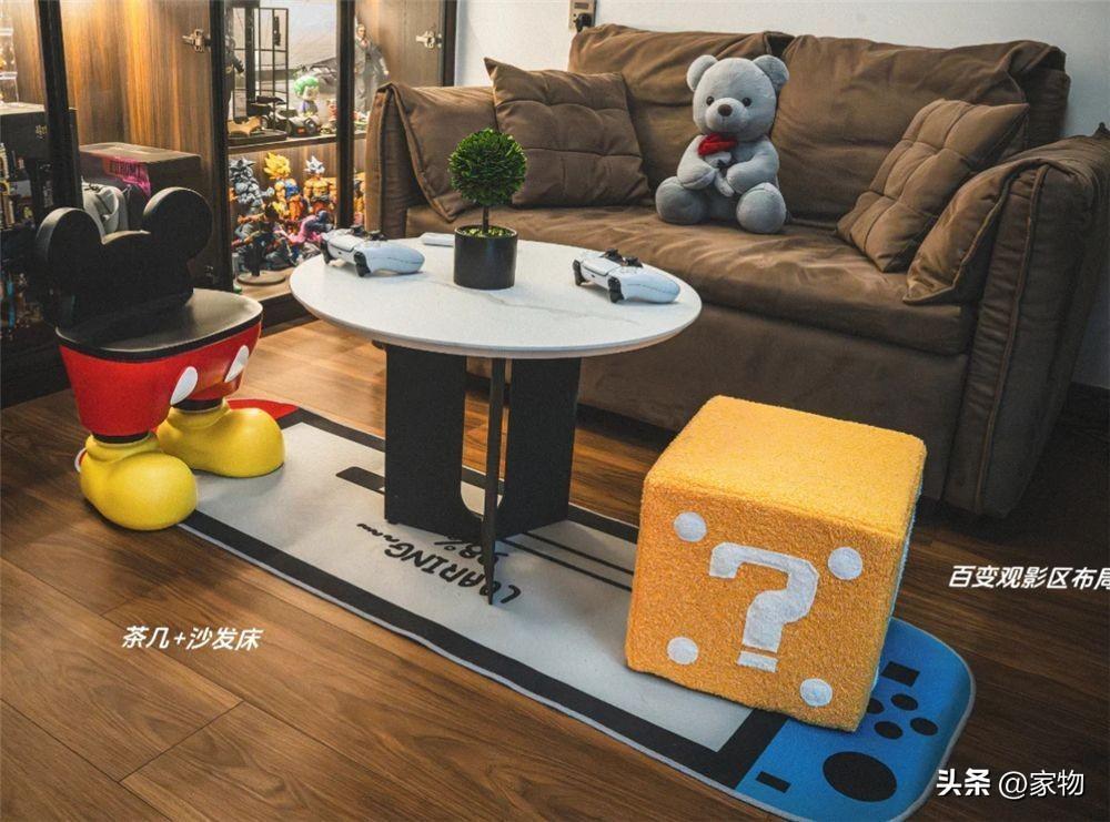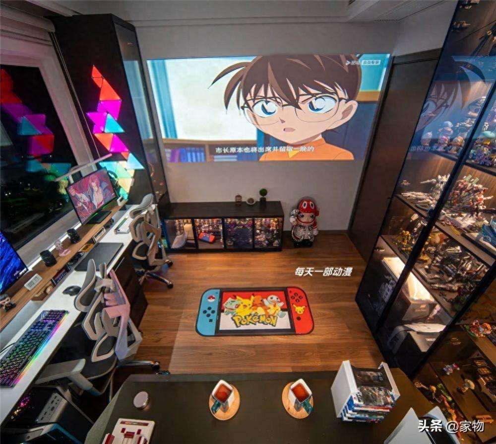 旁邊的展示櫃,則雷打不動地展示着夫妻兩人喜歡的各種手辦和模型擺件,在燈光效果的映襯下,整個空間都變得舒適愜意又很炫酷,讓人羨慕得很呢~