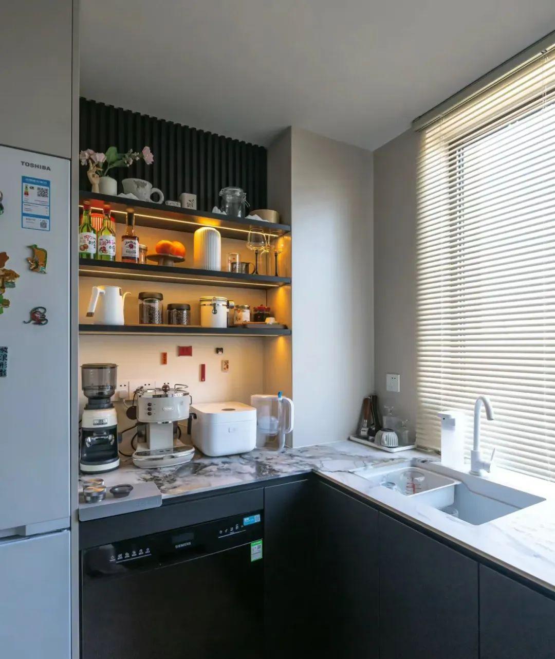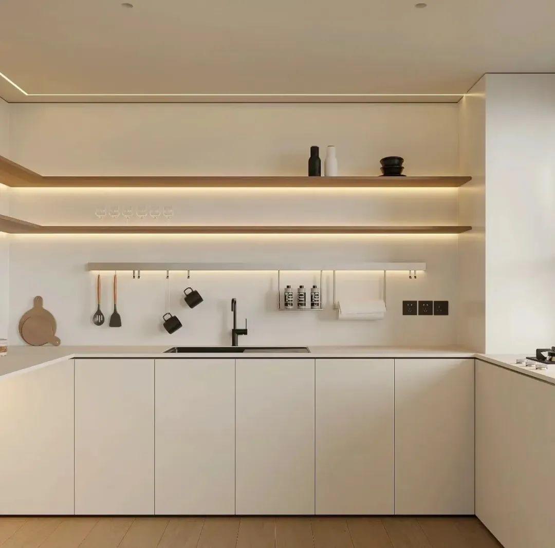 木質的層板也不錯,承重能力強,擺放物品時發出的噪音很小,層板下方裝一條燈帶,廚房也能生出氛圍感。