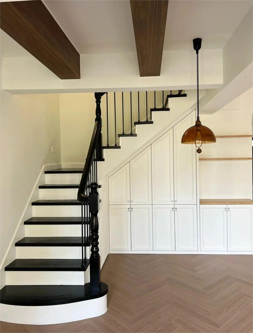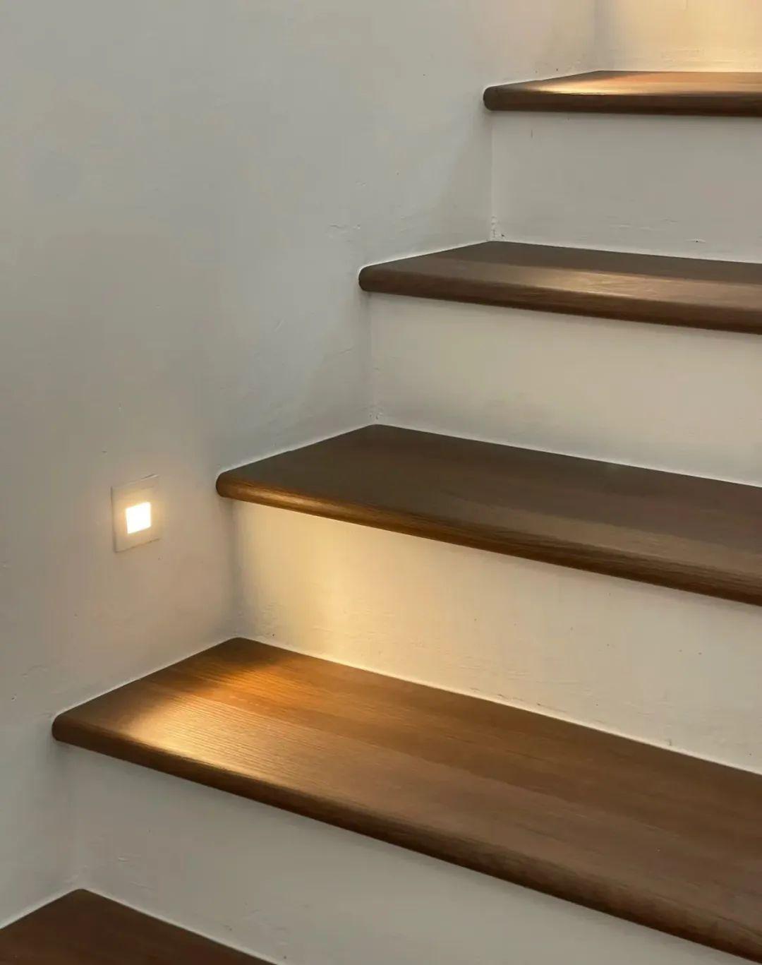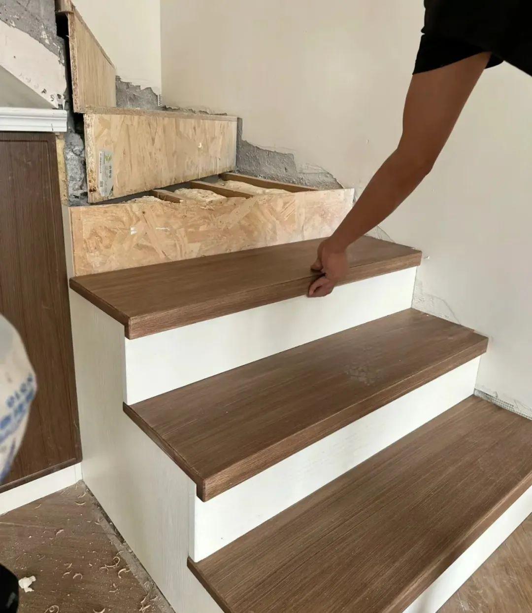 樓梯鋪貼,還有其他方案,比如兩種材質拼接,裏面歐松板打底,刷乳膠漆,上面再鋪實木臺階,得到最好的腳感,拼色造型也比較獨特,小衆。