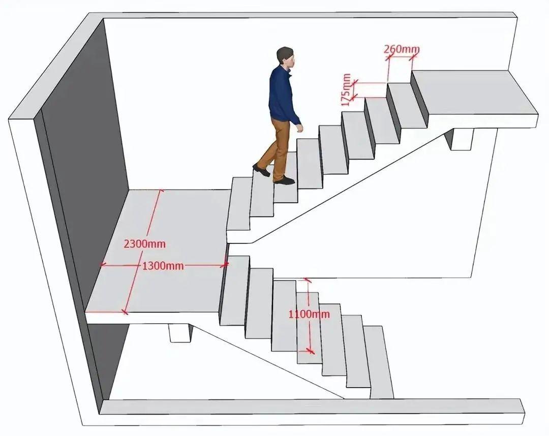 以雙跑樓梯爲例,總層17層,分爲8+9兩端,中間留230cm 長,130cm寬的轉向平臺;按照踏板高17.5cm, 踏板寬26cm, 踏板長110cm, 可算出樓梯總長需4.68m, 總寬2.3m, 17層總高爲2.98米。