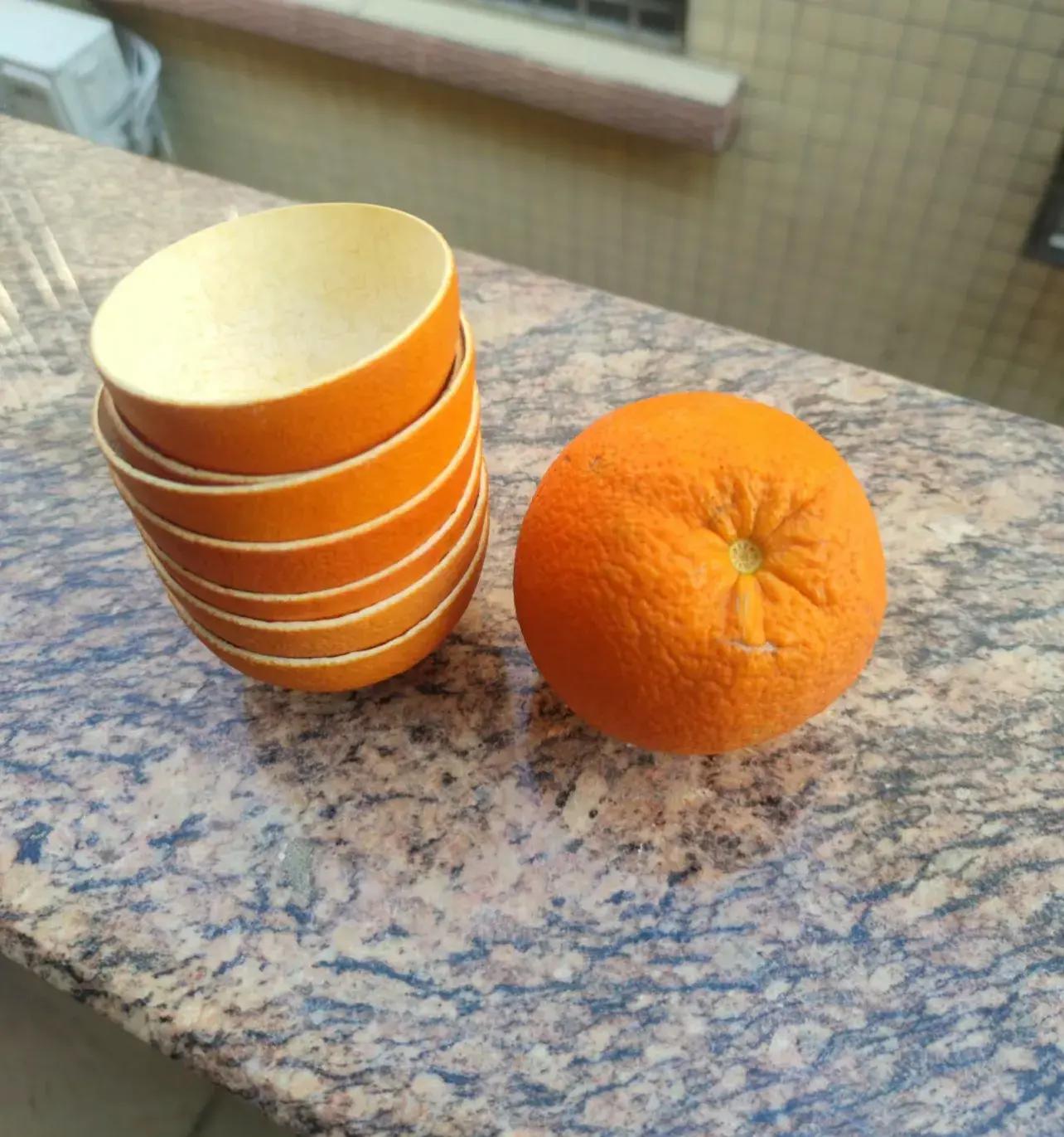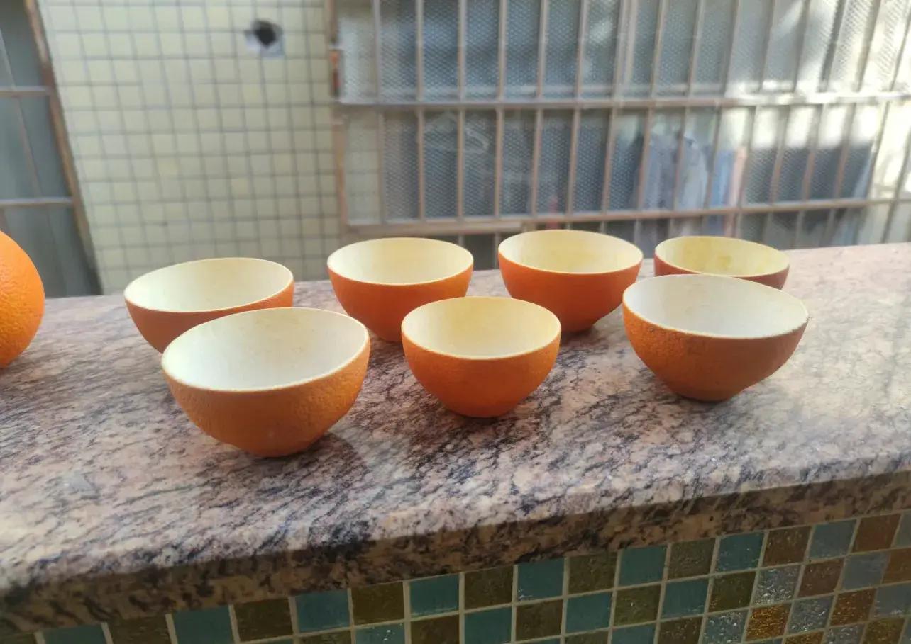 用喫完的橘子皮,定型晾乾之後,然後再上蜂蠟或大漆,橘子皮就能當茶杯用了。