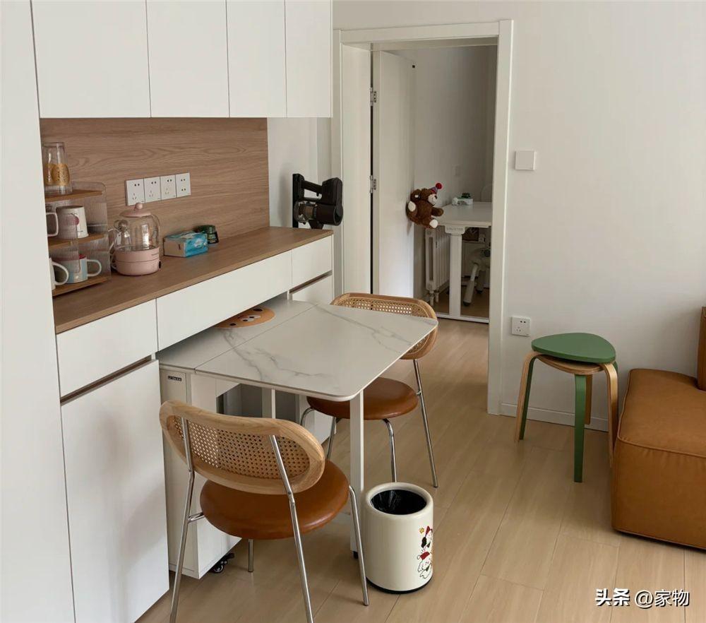 餐桌則左長城兩邊摺疊的,平日裏一半納入餐邊櫃底部,不影響進出動線,家裏有人來作客時則可以完全展開,坐下四口人輕輕鬆鬆。