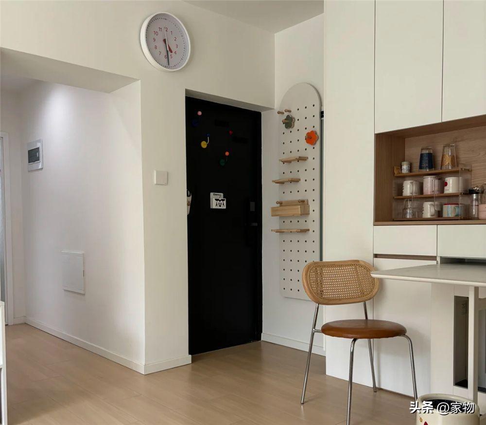 一進門的位置,是家裏的玄關和餐廳,二者皆與客廳相連,並未做隔斷,讓這間38㎡的蝸居顯得更爲寬敞一些,個人感覺這種裝修佈置相對來說還是挺適合小戶型的。