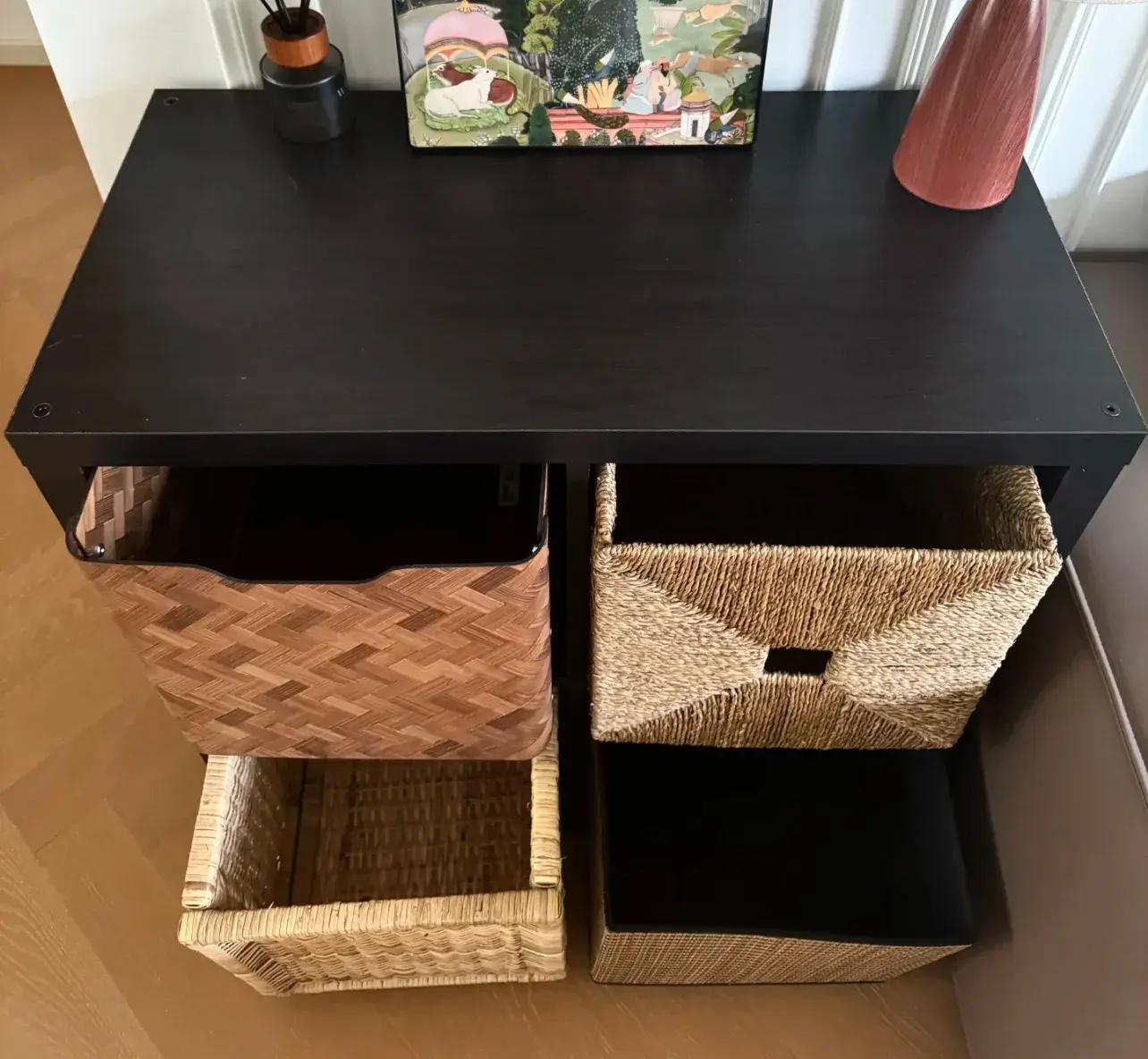 然後,淡然的回到:這種藤編籃+櫃子的形式,放東西不會顯得亂,拿取也比較方便,放玩具一絕。