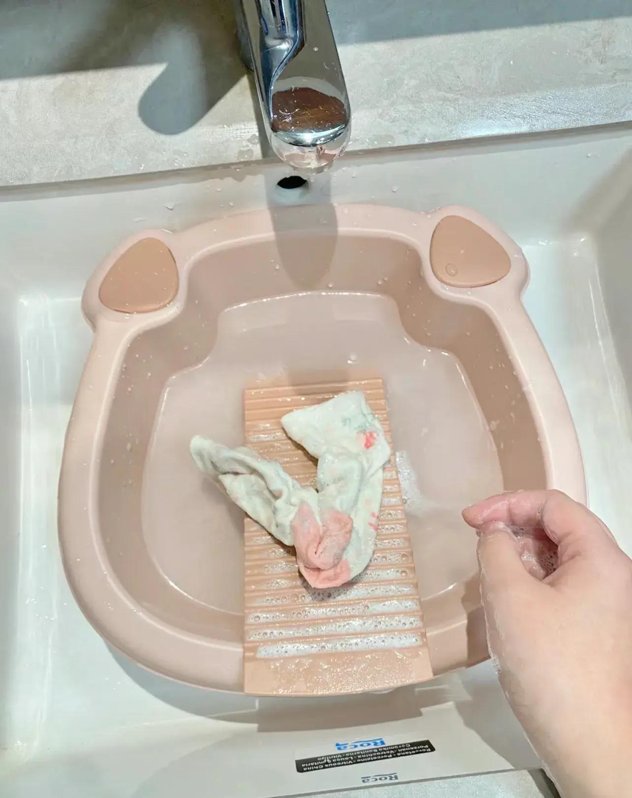 嬰兒衣服,小小一個,放到洗衣機裏怕不乾淨,手洗用搓衣板搓兩下就好;