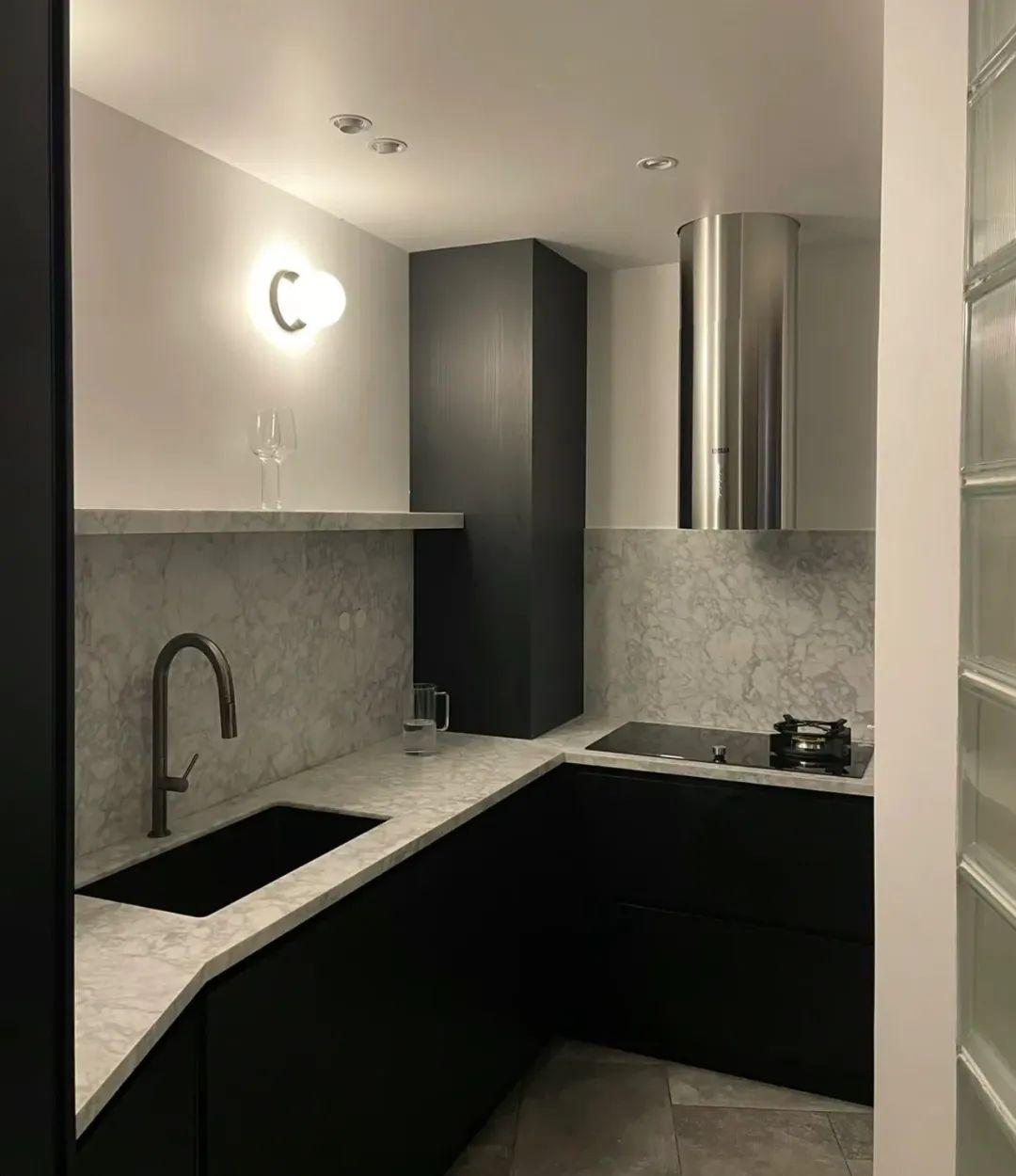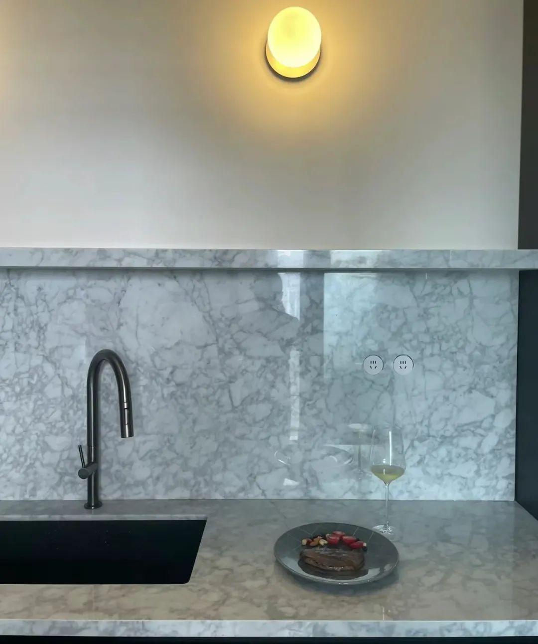 一般廚房檯面會用仿天然紋路的石材,不做吊櫃的話,可以將擋水條加長做成擋油板,再拼接同材料的石料做隔板,保持整體性,用於收納各類廚房雜物。