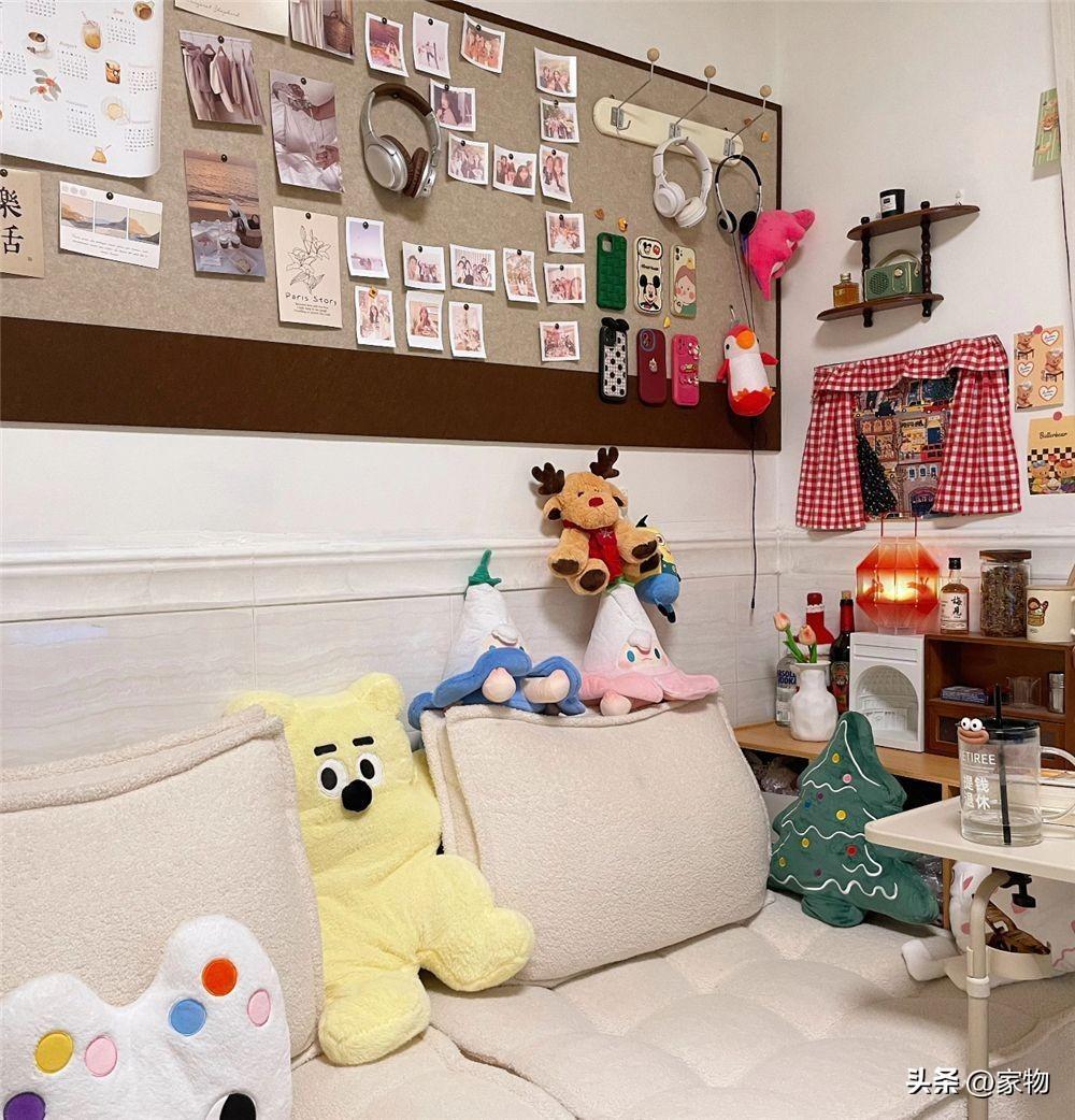 沙發一側很簡單,雖說保留了原本屋內的“腰線瓷磚”,但也算有好處,最起碼能防潮防水方便清潔,上面貼軟木板和照片裝飾,底部雙人位沙發,也能提供一個相對愜意的休閒空間。