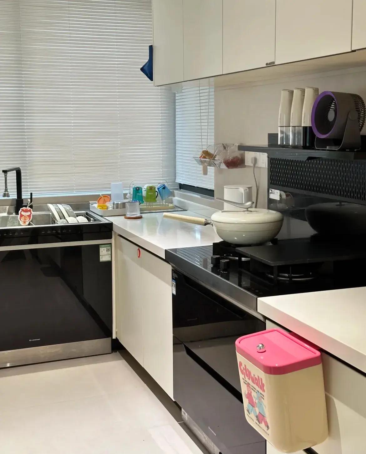 它奶油色的桶身,搭配上粉色蓋子,美的剛好合適,不會過分乍眼,又能點綴空間,顯得整個廚房色系都變溫柔了。