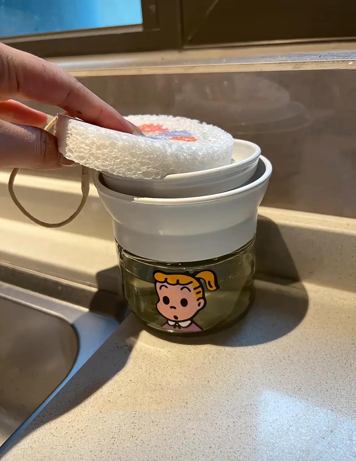 用的時候,拿海綿時順手按壓兩下,洗潔精就出來了,免去了再取瓶子、再摳蓋子、倒洗潔精等繁瑣步驟,盡顯方便。