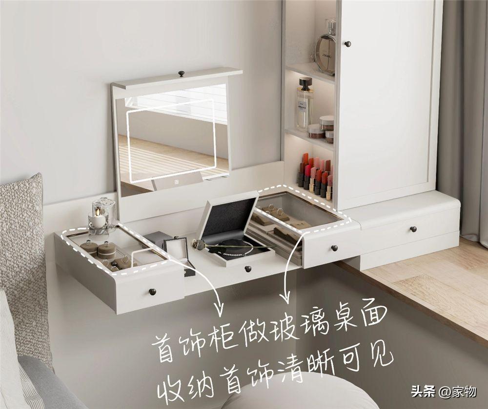 牀頭空間有限,他將飄窗抬高,與懸空式的首飾櫃,相連,櫃子兩邊做玻璃桌面,可以看到裏面收納的物品,中間抬起後,還是一面化妝鏡,搭配旁邊側櫃收納,真的太周到了。