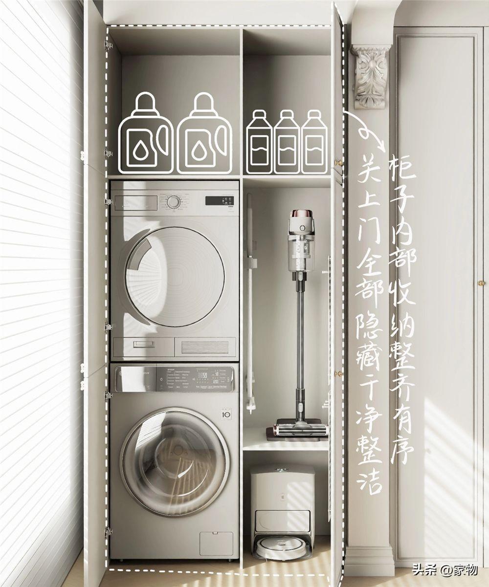 陽臺的櫃子,主要是爲了嵌入洗衣機和烘乾機套裝,和普通的帶水龍頭的陽臺櫃不同,它的旁邊做了家政櫃,放下掃地機器人和吸塵器,上面留出收納的空間,關上櫃門後整潔乾淨。
