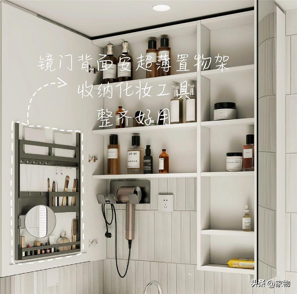 而浴室櫃上面,並沒有選擇做網紅浴室鏡,卻做了一組鏡櫃,底部留空掛吹風機,門背面做窄收納架,放些眉筆毛刷等物剛剛好;一個個的層架也能有序收納各種雜物。