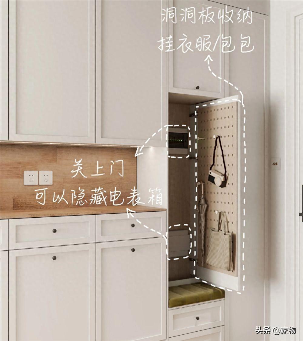 家裏的玄關,除去傳統的三段式櫃體以外,還做了一組可移動式的洞洞板,平日裏關上,電錶箱就隱藏在後面,使用時可以將其展開,掛置雨傘包包等物剛好合適。