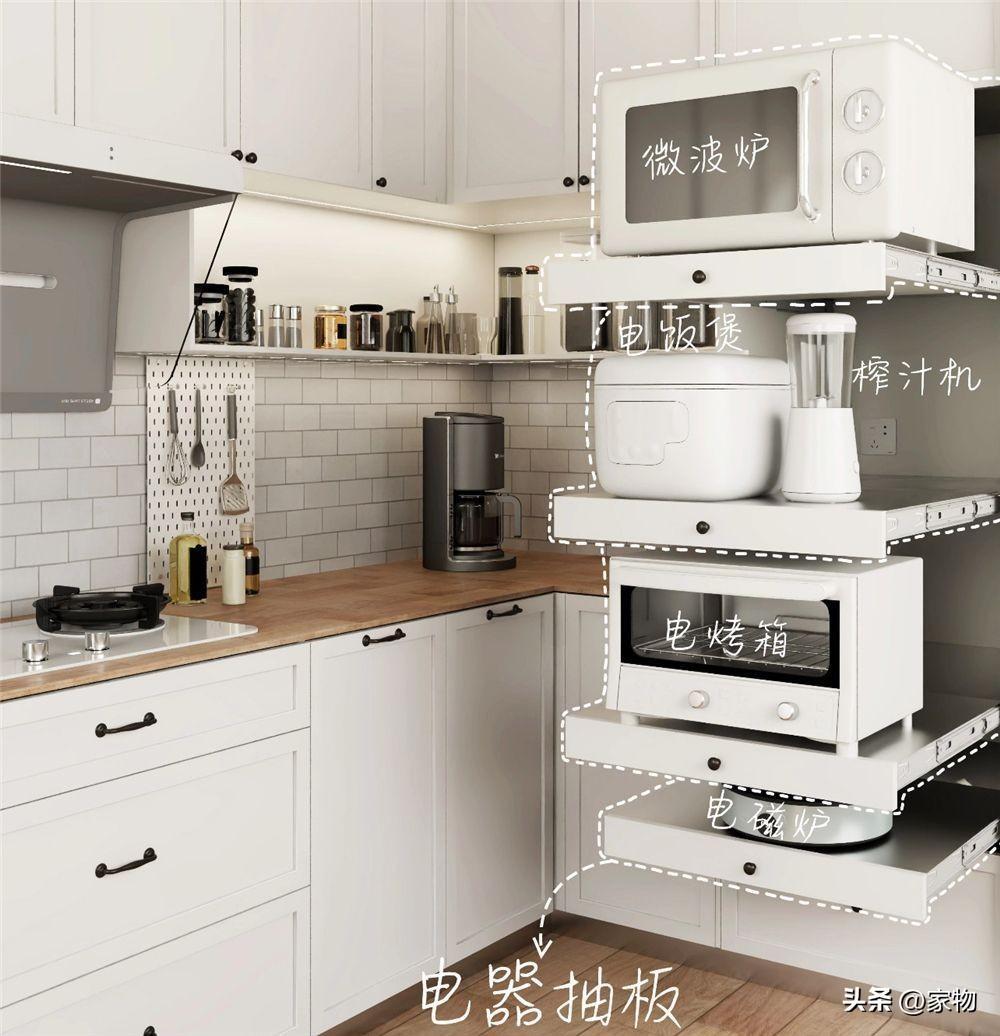 而最讓人眼前一亮的還是旁邊的小電器抽拉隔板,可以放下微波爐、電烤箱等物,用起來很方便。