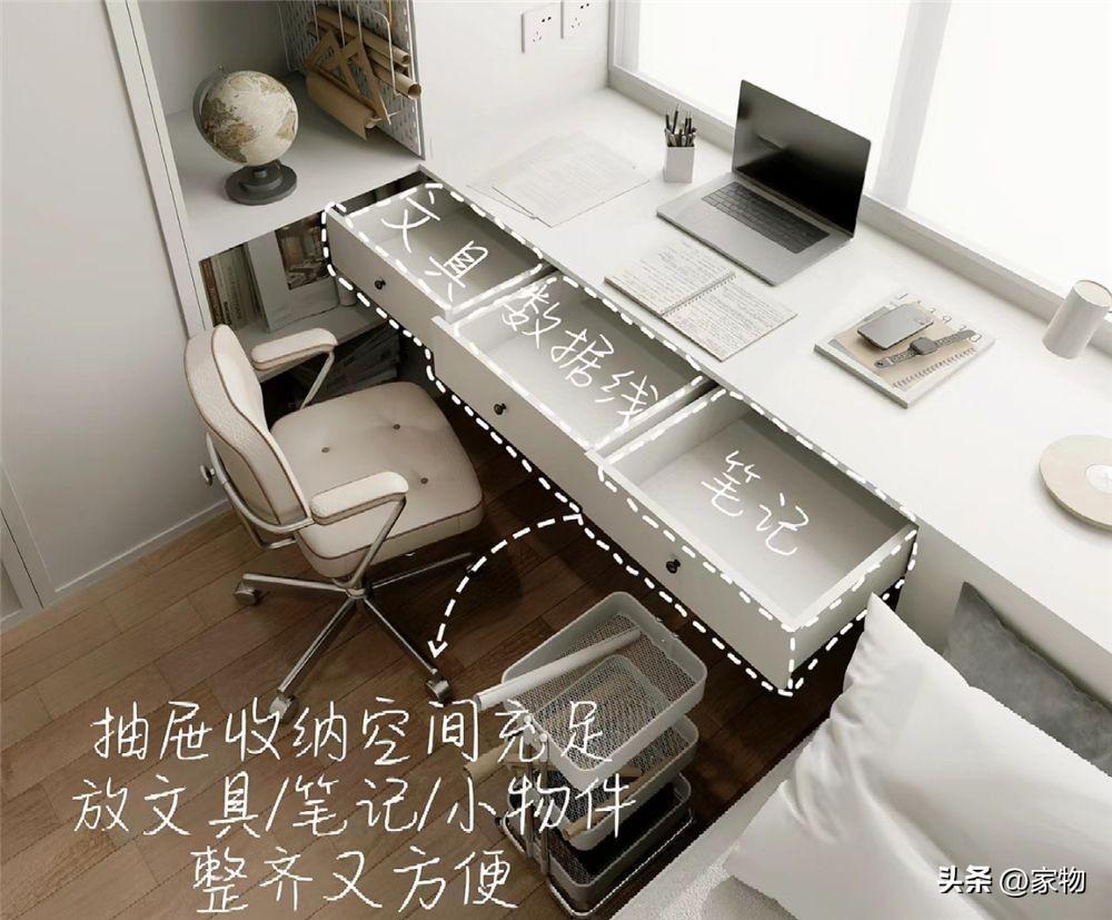 最後,家裏的書房也可圈可點,書桌主要用三個抽屜收納,分別收納文具、數據線和筆記,底部則用一個帶輪子的小推車靈活收納,各種零散小物都可以塞到裏面。