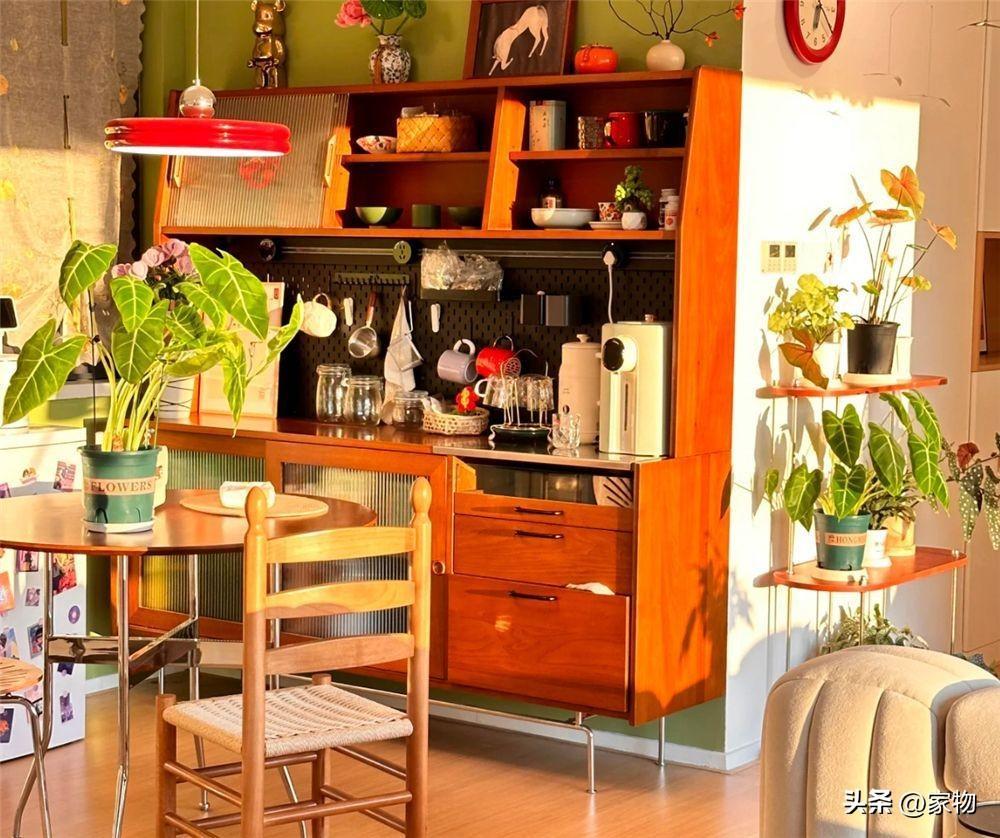 我個人還是挺喜歡餐桌旁邊這組餐邊櫃的,分成了三段式的櫃身,上面櫃子可以放擺件,中間放置飲水機等小家電,底部還可以收納一些不常用的零碎小物,恰到好處。