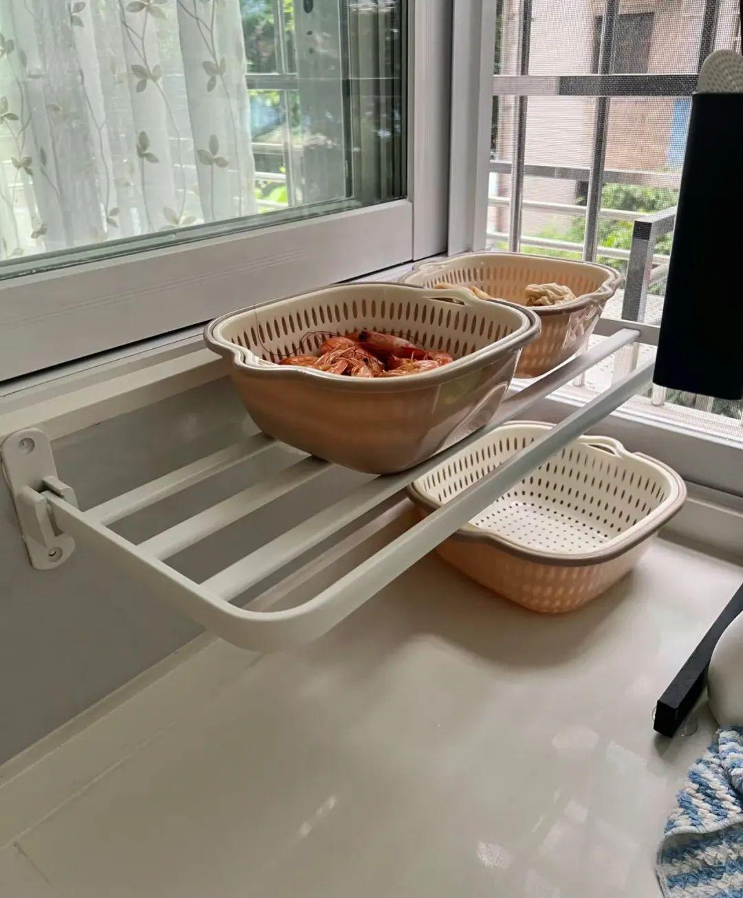 不需要打孔,直接免釘膠上牆,也很牢固,承重能力非常OK。打開後,直接擴大一倍料理檯面積,洗好蔬菜的瀝水籃、備菜餐盤都可以放上去,留出切菜區。