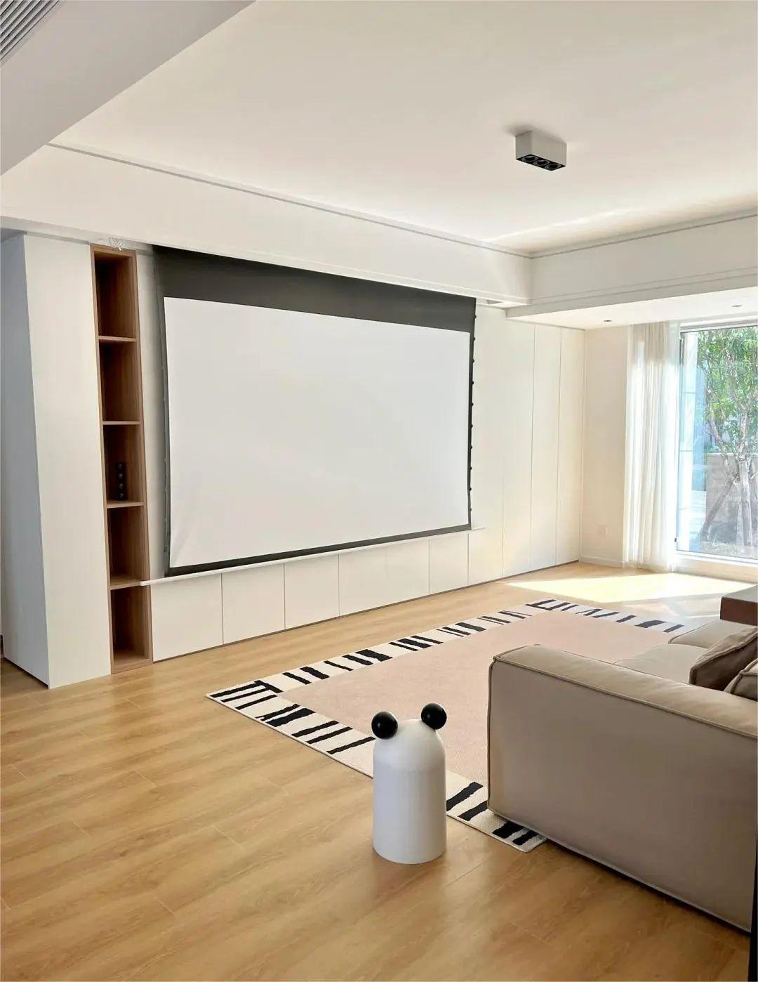 更好的選擇是軟幕布,可以捲成一卷,做成升降模式,不用了收進吊頂裏,還不影響整牆書架或者收納櫃的使用。