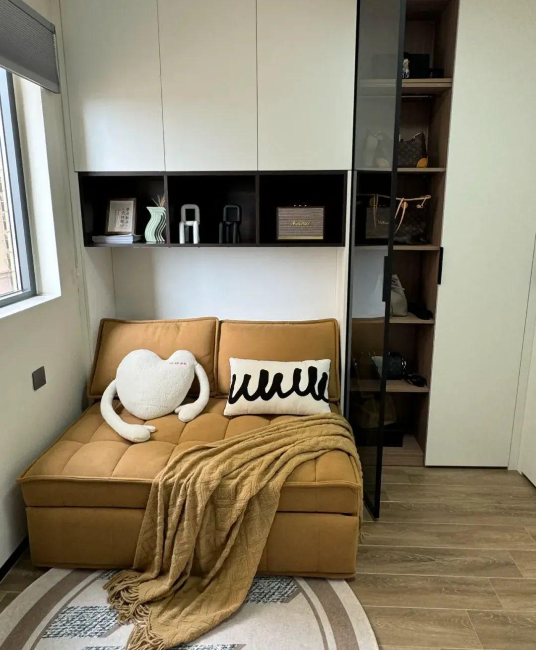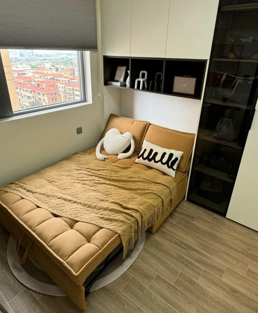 次臥不經常住人的話,再安置個牀就太佔空間,浪費可用面積,不如換成沙發牀。