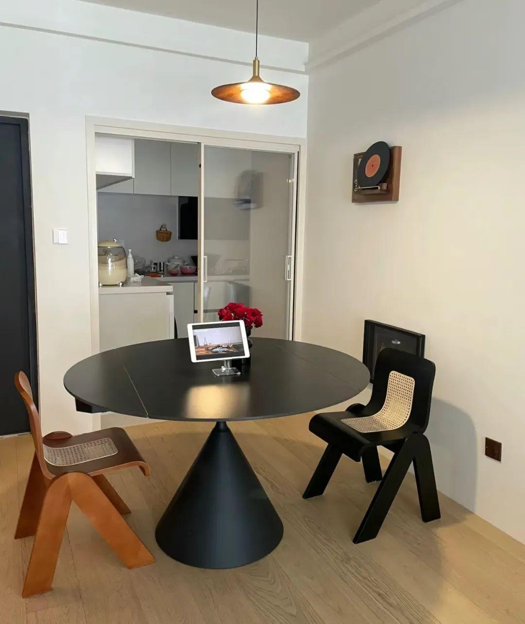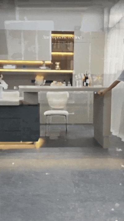 桌腳還能安裝萬向輪,推進去島臺底部重合,減少空間佔用,這類變形傢俱纔是真正解決小戶型痛點的設計。