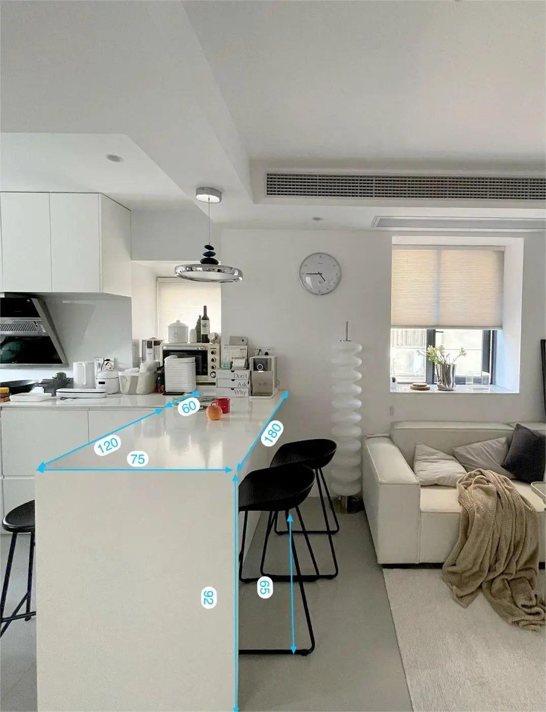 但是島臺和餐桌二合一,存在尺寸差異的矛盾,要知道人站着操作料理適宜的桌面高度在90cm左右,而坐着就餐適宜的餐桌高度在75cm, 好多人選擇遷就島臺高度,用加高吧檯椅,增加坐高,但這無疑會降低舒適度。