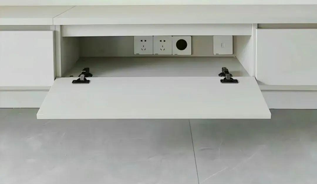 現在很多電視櫃都選擇定製櫃,中間插座的位置,通常有兩種做法:下翻門和抽拉式。