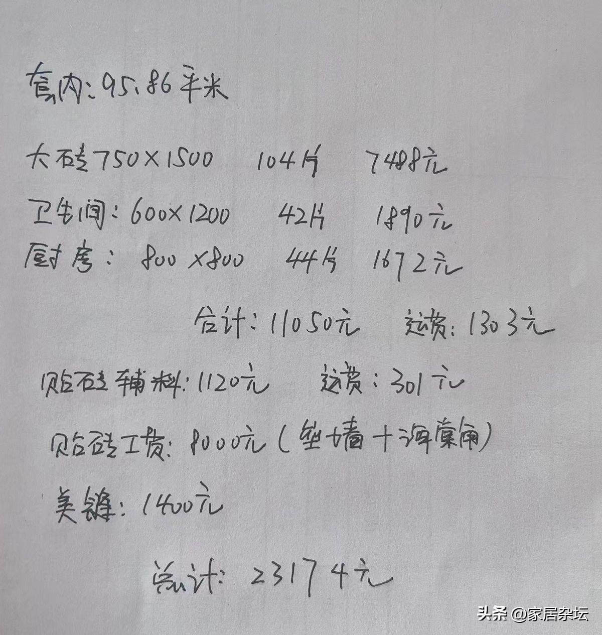 可是,最後他老婆堅持的是瓷磚通鋪,發現整整超了1萬元,花了25,000元。