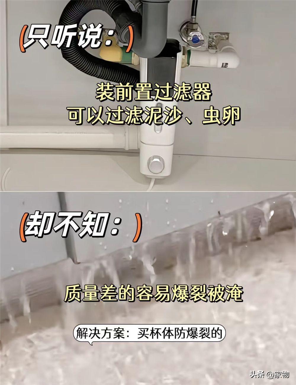 真的有不少人喫過前置濾水器的虧,買了雜牌的導致爆裂漏水,重新裝事小,淹到鄰居家還得賠錢事大,若要裝前置濾水器,一定別貪圖便宜買雜牌,最起碼要買杯體帶防爆功能的。