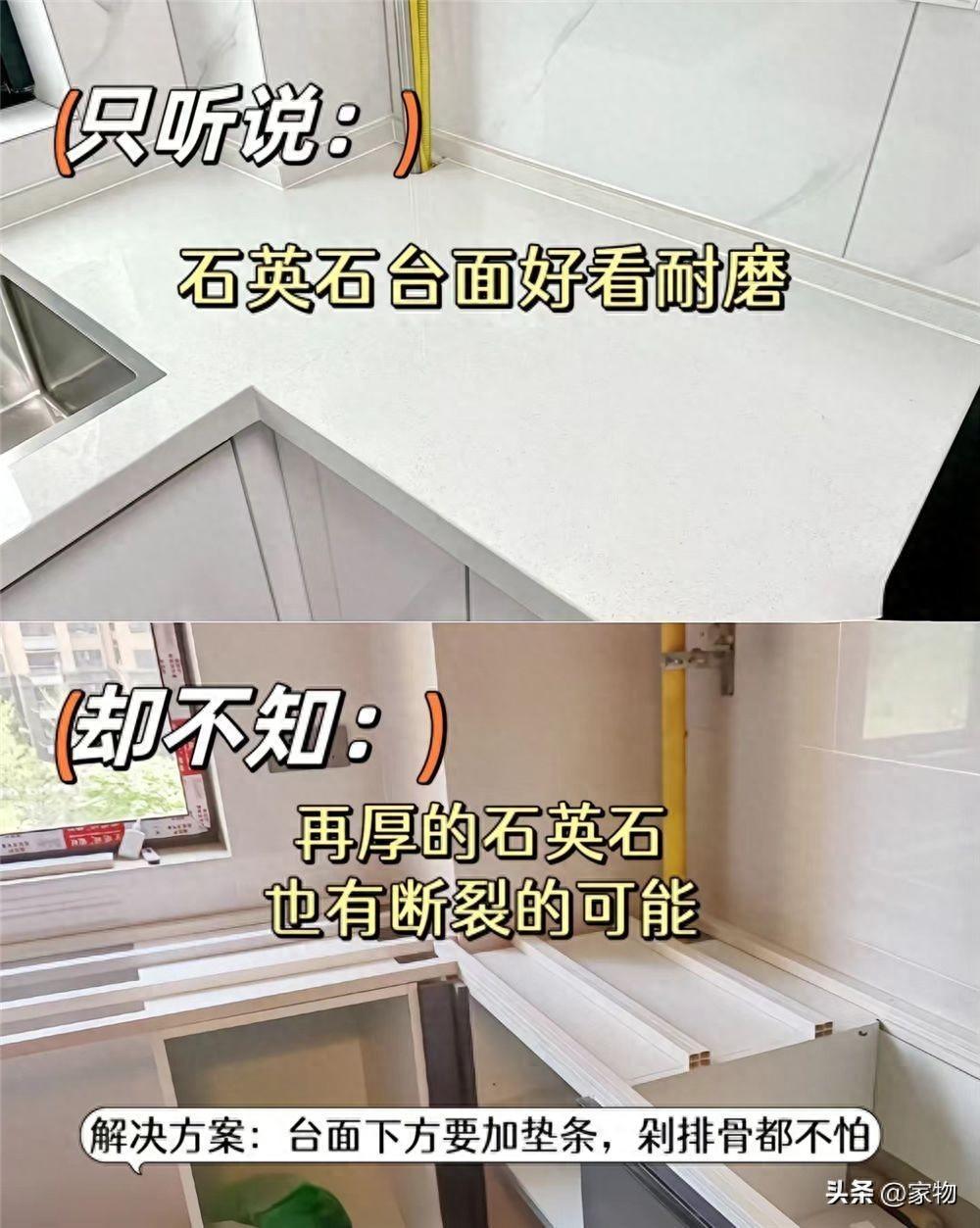 很多人都會告訴你,做櫥櫃檯面,石英石臺面一定要選較厚的,纔不會開裂,但殊不知這只是一方面,最主要的是檯面下面要加墊條分散受力,才能真正起到避免開裂的效果。