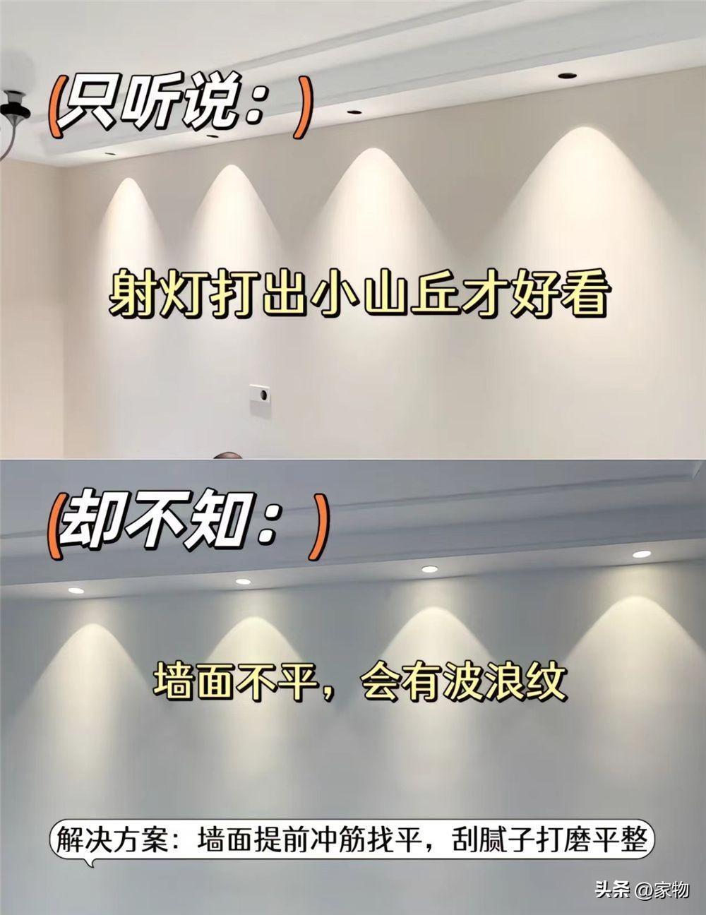 射燈洗牆,做小山丘確實好看,但前提是,你家裏的牆面要平啊!很多人家裏牆面找平的時候就沒把這事兒放心上,到最後做了射燈反而成爲牆面的照妖鏡,讓牆面看起來坑坑窪窪。