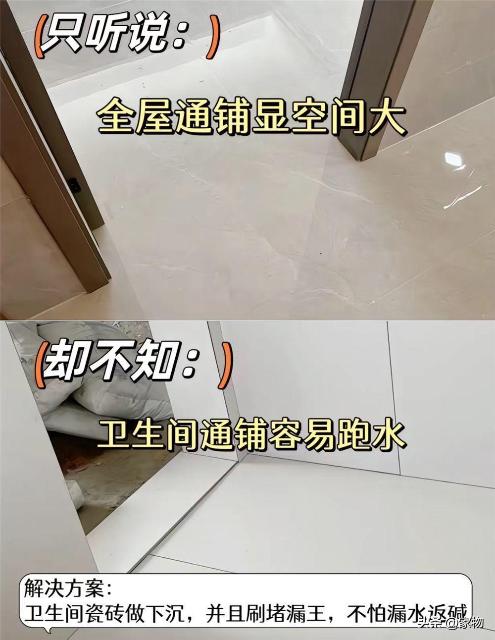 全屋通鋪確實沒說錯,會讓家居空間顯得連貫寬敞,但這裏不包括廁所,衛生間的位置還是做抬高爲好,有個過門石,能避免漏水反鹼問題的出現,這點非常重要。